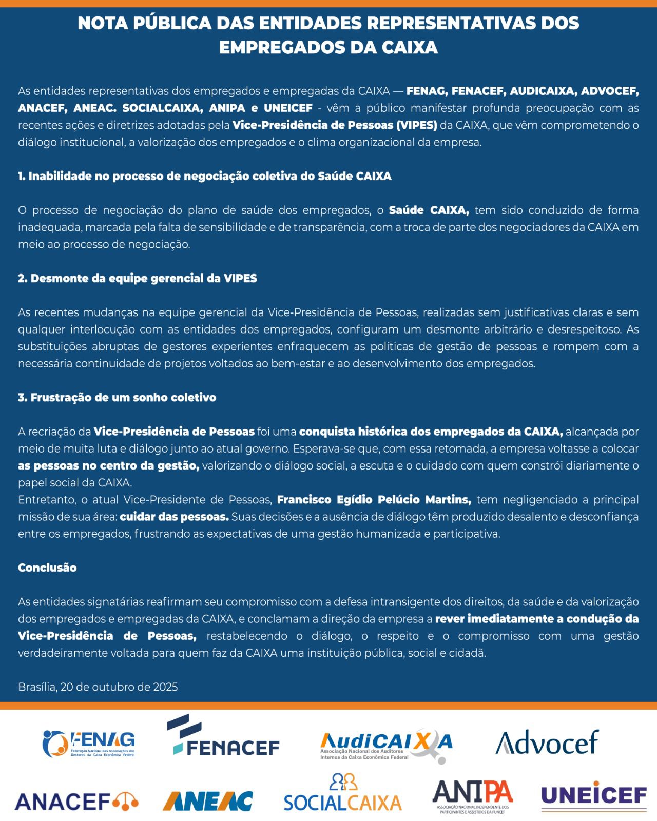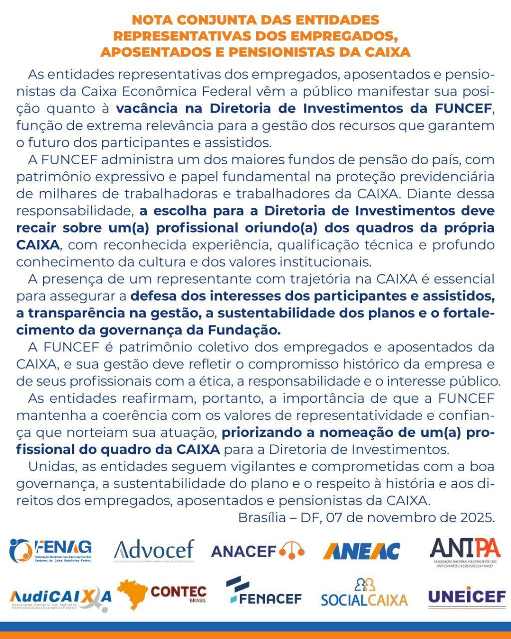 Aos auditores internos da Caixa que procuram por uma entidade representante legítima perante o banco público, o governo e a opinião pública, a AUDICAIXA atua nacionalmente em defesa de seus direitos e interesses pela valorização da classe e por relações trabalhistas adequadas.